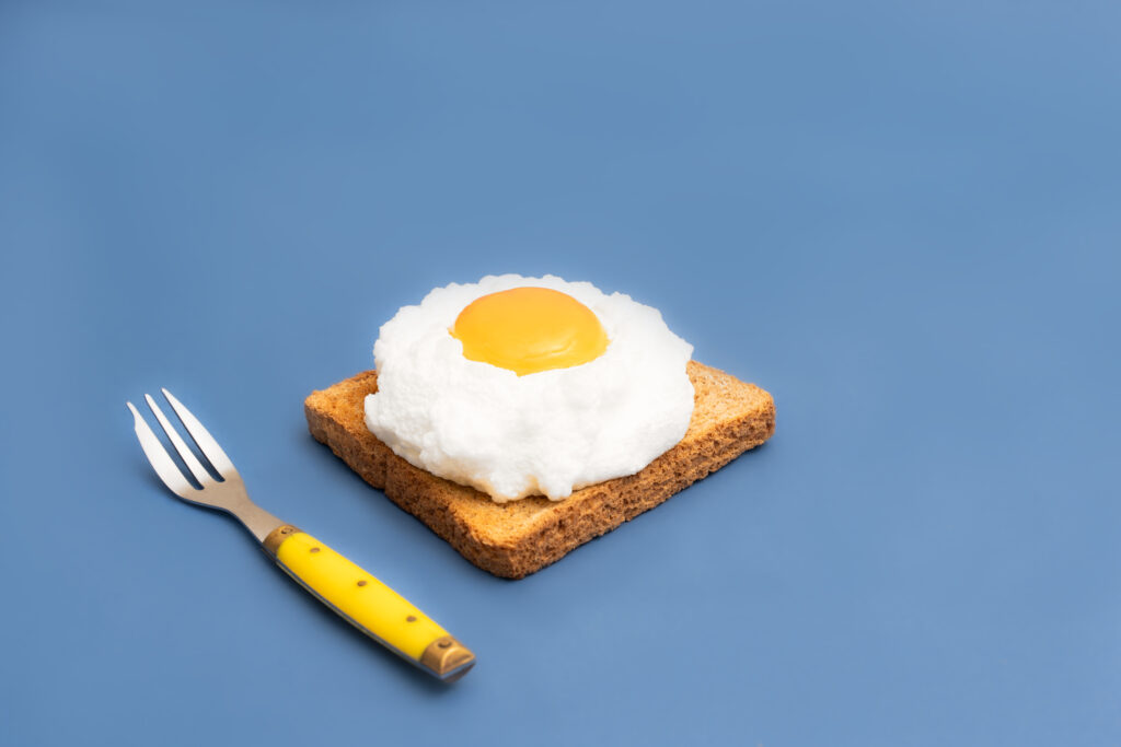Soft boiled egg with liquid yolk on egg cup. Protein food
